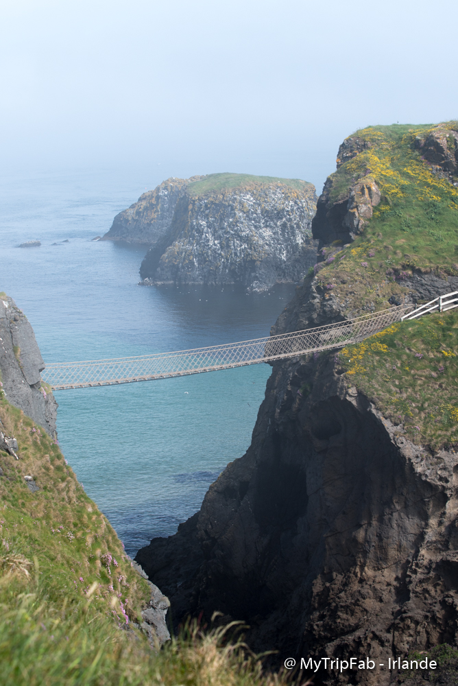 Long de 20m, il surplombe à environ 30m l’océan et les falaises abruptes de l’île de Carrick. Si vous n’avez pas peur du vide, la vue sur le littoral à elle seule vaut le détour! Nous avons eu un temps clair ce matin et avons pu apercevoir l’île de Rathlin et les îles écossaises.