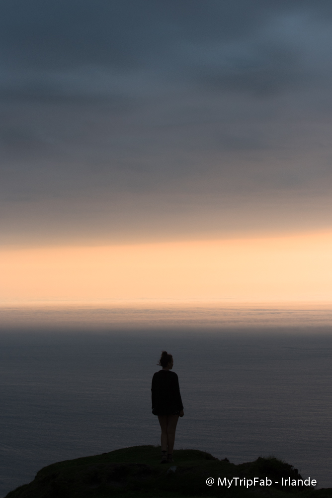 Arrivé au sommet, la vue est spectaculaire et les mots manquent pour décrire la splendeur du panorama. La falaise côtoie les nuages, l’océan, les lacs… Le ciel est dégagé et nous admirons la baie de Donegal, Leitrim et même le mont Ben Bulben. Le contraste entre les camaïeux de bleus de l’océan et de verts de l’intérieur des terres est saisissant! On a l’impression d’être seuls au bout du monde. Un moment fort qui restera gravé dans notre mémoire.