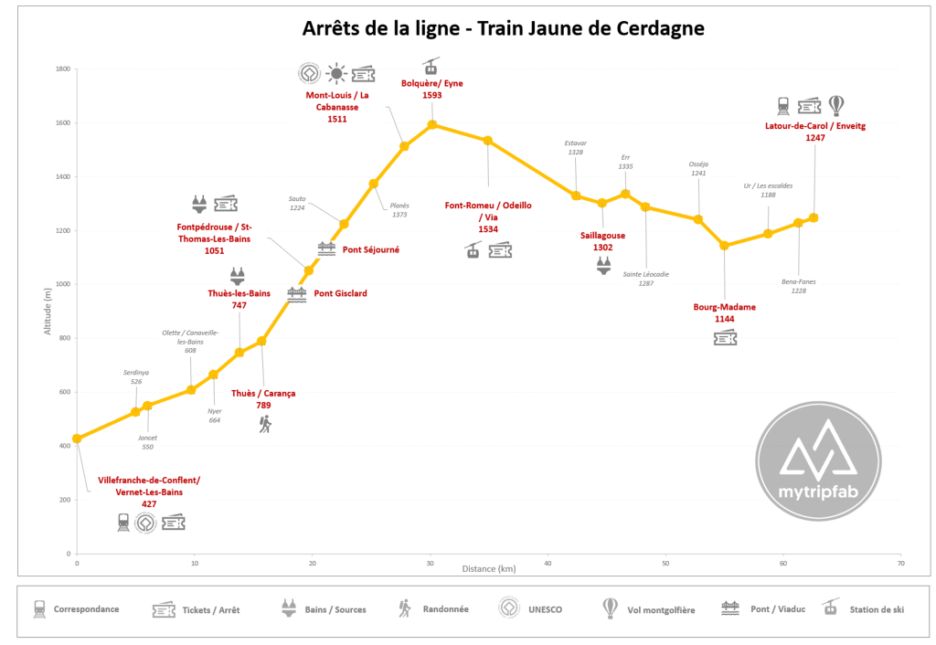 - A Villefranche-de-Conflent : correspondance avec le TER en direction de Perpignan.
